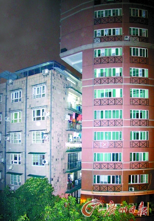 新聞提示:采光和通風(fēng)的墻面完全被遮蓋,白天上樓梯要打手電筒,晚上睡覺被霓虹燈刺眼難入眠,樓頂天臺還飄出了4米寬、10層高的樓房,黑壓壓有如一座大山壓頂。2005年前后,14戶業(yè)主入住海珠中路215號商品房,沒想到一年后旁邊竟建起了高層住宅,把北側(cè)通風(fēng)采光的墻壁完全遮蓋,從此住戶的平靜生活被徹底打破。兩年以來,居民多處投訴,開發(fā)商卻有合法證照在身。針對多處疑問,記者進(jìn)行了調(diào)查。