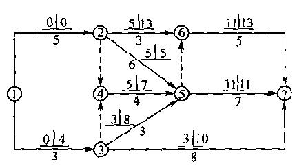 解析:工作2-6的自由時(shí)差=11-5-3=3;工作3-5的自由時(shí)差=min{11-3-3,11-3-3}=5;工作4-5的總時(shí)差=7-5=2,工作6-7的總時(shí)差=13-11=2;工作3-7的總時(shí)差=10-3=7,工作3-7的自由時(shí)差=18-3-8=7;由于工作1-2的總時(shí)差為0,故其自由時(shí)差也必為0;工作1-3的自由時(shí)差=min{3-0-3,3-0-3,5-0-3}=0;工作1-3的總時(shí)差=4-0=4。