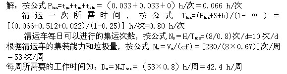13、某住宅區(qū)生活垃圾量約280m3/周,擬用一垃圾車負責清運工作,實行改良操作法的移動式清運。已知該車每次集裝容積為8m3/次,容器利用系數為0.67,垃圾車采用八小時工作制。試求為及時清運該住宅垃圾,每周需出動清運多少次?累計工作多少小時?經調查已知:平均運輸時間為0.512h/次,容器裝車時間為0.033h/次;容器放回原處時間0.033h/次,卸車時間0.022h/次;非生產時間占全部工時25%。
