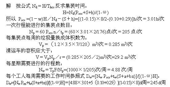 14、某住宅區(qū)共有1000戶居民,由2個工人負責清運該區(qū)垃圾。試按固定式清運方式,計算每個工人清運時間及清運車容積,已知條件如下:每一集裝點平均服務人數3.5人;垃圾單位產量1.2kg/(d/人);容器內垃圾的容重120kg/m3;每個集裝點設0.12m3的容器二個;收集頻率每周一次;收集車壓縮比為2;來回運距24km;每天工作8小時,每次行程2次;卸車時間0.10h/次;運輸時間0.29h/次;每個集裝點需要的人工集裝時間為1.76分/點/人);非生產時間占15%。