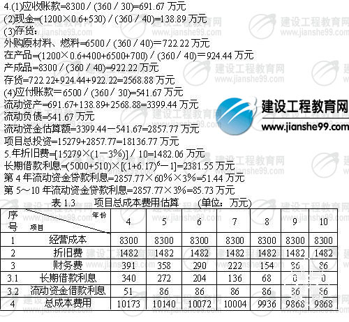 ?。?)項(xiàng)目投產(chǎn)后定員1200人,每人每年工資和福利6000元,每年的其他費(fèi)用530萬元(其中其他制造費(fèi)用400萬元)。每年經(jīng)營成本為 8300萬元。各項(xiàng)流動資金的最低周轉(zhuǎn)天數(shù)分別為:應(yīng)收賬款30天,現(xiàn)金40天,應(yīng)付賬款30天,存貨40天。所需流動資金全部以貸款方式籌集,擬在運(yùn)營期第一年貸入60%,第二年貸入40%,流動資金貸款利率為3%(按年計(jì)息),還款方式為運(yùn)營期內(nèi)每年末只還所欠利息,項(xiàng)目期末償還本金。