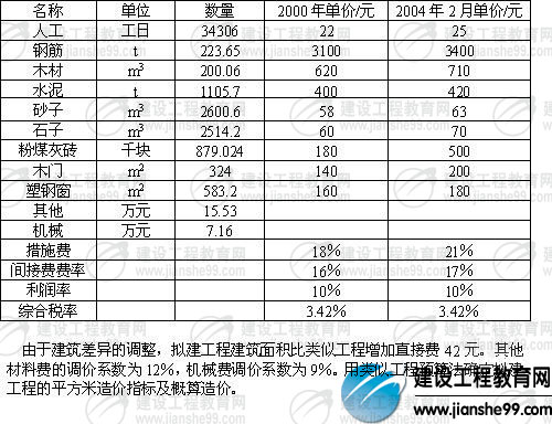 2、某單位擬建一建筑面積為6000m2的多層住宅樓工程,編制土建工程概算時(shí),參照2000年建造的某建筑面積5200m2的類似工程預(yù)算資料見表1.4: