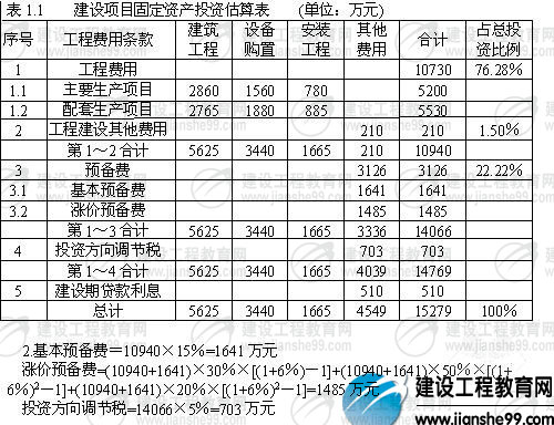 表1.1    建設(shè)項(xiàng)目固定資產(chǎn)投資估算表    (單位:萬元)
