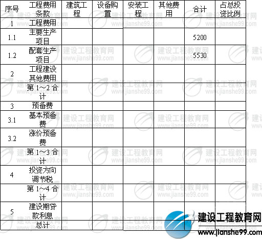 ?。?)主要生產(chǎn)項(xiàng)目5200萬元,其中:建設(shè)工程費(fèi)占55%,設(shè)備購置費(fèi)占30%,安裝工程費(fèi)占15%。
