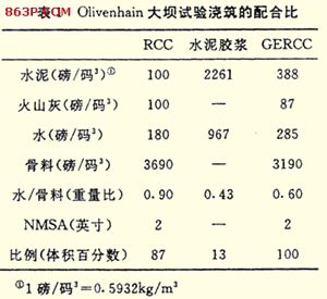 Olivenhain大壩的RCC澆筑試驗(yàn)包括GERCC作為護(hù)面系統(tǒng)和作為RCC與巖石的接觸面的壩肩處理兩種情況的研究。該過程的第一步是選定GERCC的目標(biāo)配合比;旌狭显O(shè)計(jì)過程的基本途徑是將RCC改變成坍落度約為7~10cm ,抗壓強(qiáng)度為20.6MN/m2的非加氣常規(guī)混凝土。采用ACI211中的標(biāo)準(zhǔn)慣例 ,GERCC要求膠結(jié)材料的含量約281.7kg/m3和含水量169kg/m3.由于RCC配合比是預(yù)先確定的,因此水泥漿的配合比和水泥膠漿與RCC的比率即為獲得理想的GERCC混合料的剩余變量,這些值是計(jì)算得出的。表1所示的水泥膠漿、RCC和GERCC各自的配合比是第一次澆筑試驗(yàn)用的!