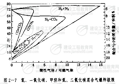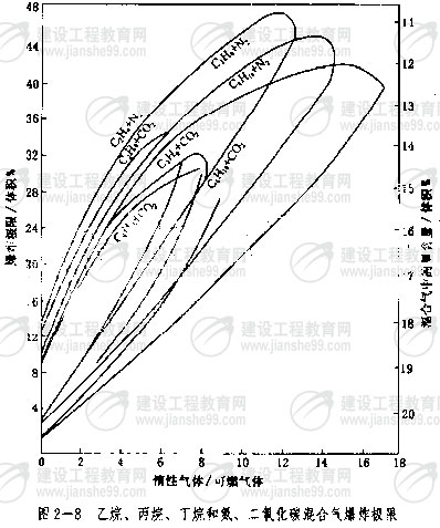 如果爆炸性混合氣體中含有惰性氣體如氮、二氧化碳等,計(jì)算爆炸極限時(shí),可先求出混合物中由可燃?xì)怏w和惰性氣體分別組成的混合比,再從圖2—7和圖2—8中找出它們的爆炸極限,并分別代入式(2—13)中求得。