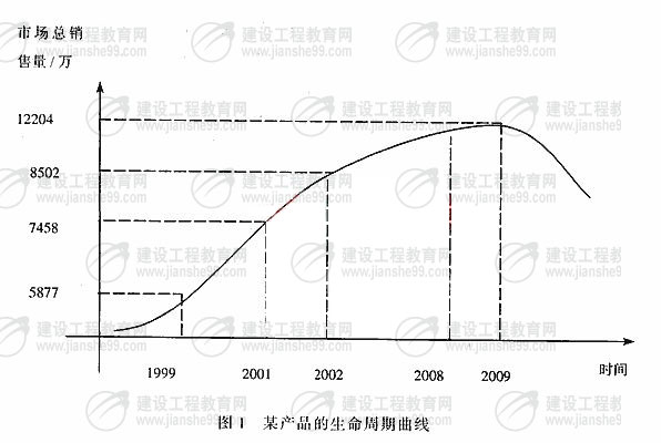 3.根據相關預測(如圖1),1999年至2002年該產品處于成長階段,之后進入成熟期發(fā)展階段,A公司預計2009年該產品的總體市場銷售達到1.2204億元,公司根據近幾年的發(fā)展制定了主要針對B公司的競爭戰(zhàn)略,計劃2008年公司的市場絕對占有率能夠達到37%,擠占B公司的市場份額,使其市場銷售量最多只能達到3100萬元左右。