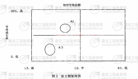 2.已知2001年A公司的市場銷售量為2386.5萬元,B公司的市場銷售量為2130萬元,利用圖1給出的數據對A公司的該項業(yè)務進行波士頓矩陣分析,并指出公司對該項業(yè)務應當采取的戰(zhàn)略措施。