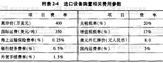 某新建項(xiàng)目,主要生產(chǎn)設(shè)備從國(guó)外進(jìn)口,設(shè)備重量1500噸,購(gòu)置該進(jìn)口設(shè)備的相關(guān)費(fèi)用參數(shù)如下(見(jiàn)附表2-4);輔助生產(chǎn)設(shè)備投資額按照主要生產(chǎn)設(shè)備投資額的20%取定。