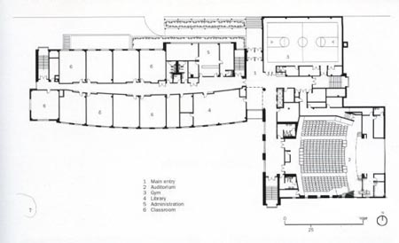 The Health Sciences Center provides new classrooms, la ho rat ones, faculty offices, and administrative space for the College of Pharmacy and 1 leallh Sciences, and the College of Nursing of I ong Island University, ‘n addition, several large lecture rooms for use by the entire university are located in the building. The corner site serves as a major pedestrian and vehicular entrance to the campus. The new building, a southern gateway to the campus, is flanked by a new gate and guard kiosk. Included in the program are six stories of programmed spate, a rooftop penthouse, and a partial basement which contains mechanical systems. University lecture rooms are located on the first floor, with the building lobby, primary entrance, and elevators at the north, facing the courtyard. Administrative areas on the upper floors overlook the courtyard. Faculty offices arc arranged along the west, sit It: of ihe building facing (he pedestrian corridor.