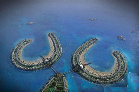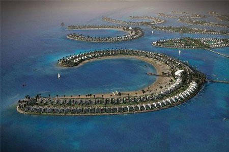 Durrat Al Bahrain整個計劃面積達20平方公里,內(nèi)含13個人工島嶼,以新月型的島嶼(Crescent)為中心,5個花瓣型島嶼(Petal), 依序環(huán)繞,最外層還有6個弧型島嶼(Atoll)。Atoll與Petal,都是建筑獨棟海景別墅的基地,在此每一戶皆享有私人沙灘或停泊船只的小碼頭,無論景觀或是設備都是一流的,這由照片就可以清楚看出。
