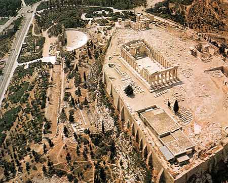 雅典城得名于女神雅典娜 ,而衛(wèi)城則是供奉雅典娜的地方,原為雅典奴隸主的城堡,公元前5世紀雅典奴隸制民主政治時期改建為宗教活動中心。它位于雅典城中心偏南的一座小山頂?shù)呐_地上,是希臘建筑藝術(shù)的代表作品。