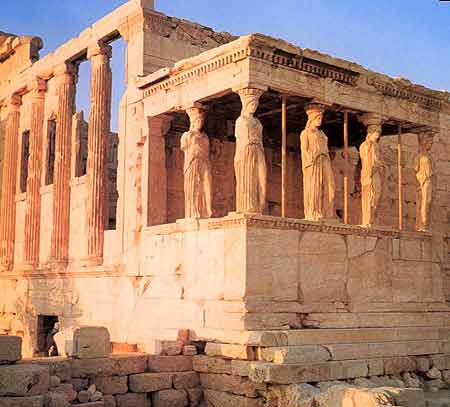 厄瑞克提翁神廟位于帕提儂神廟的對面。 這是一座愛奧尼亞式的神殿,建于公元前421-前405年,是培里克里斯制訂的重建衛(wèi)城山計劃中最后完成的重要建筑。神廟因其形體復(fù)雜和精致完美而著名。它的東立面由6根愛奧尼亞柱構(gòu)成入口柱廊,西部地基低,西立面在4. 8米高的墻上設(shè)置柱廊。西部的入口柱廊虛實相映。南立面的西端,突出一個小型柱廊,用女性雕像作為承重柱,她們束胸長裙,輕盈飄逸,亭亭玉立,是這座神廟最引人注目的地方,在古典建筑中也是罕見的。雕像正面朝南,在白色大理石墻面的襯托下,格外清晰悅目。神廟中的雅典娜女神雕像是所有雅典娜雕像的藍本。神廟名稱的由來說法不一,一說為紀念傳說中的雅典王厄瑞克西阿斯,一說是紀念希臘英雄厄瑞克蘇尼阿斯。神廟屢遭兵毀,已遠失原貌,廟內(nèi)文物也散失殆盡。