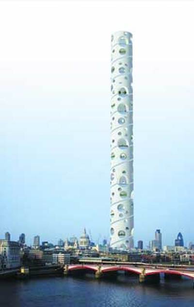 英國(guó)“流行建筑”公司正打算在倫敦建造一座史無(wú)前例的300層摩天塔樓——它將有1524米高,形如一根高聳入云的雪茄。塔樓中將有數(shù)十萬(wàn)套公寓、商業(yè)中心、劇院,甚至還將建造多個(gè)公共廣場(chǎng)、學(xué)校和醫(yī)院,據(jù)稱可容納100萬(wàn)人同時(shí)居住,堪稱一座名副其實(shí)的“塔中城市”!皞惗赝ㄌ焖蹦壳叭蕴幱跇(gòu)想階段,有望在2016年之前完工。值得一提的是,由于經(jīng)過(guò)特殊設(shè)計(jì),即便將來(lái)居民入住之后,“倫敦通天塔”仍可以像搭建積木一樣,繼續(xù)往高空修建。