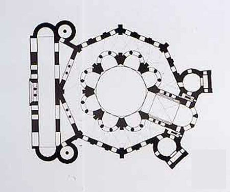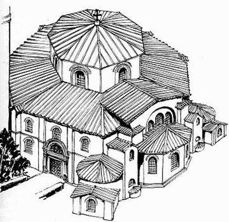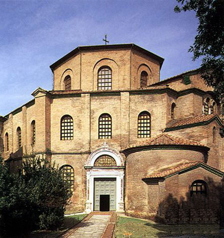 主要特征:中堂由8個由半圓拱券聯(lián)系在一起的柱垛圍合而成,柱垛間的柱子按凸出的半圓形排列,形成花瓣形中堂。中堂上部是八角形的空心磚砌穹頂,其上有架在木屋架上的八角形坡屋頂。側(cè)廊為八角形平面,豎向為兩層,外墻直接反映了側(cè)廊的平面形狀,整個建筑形體具有高度的向心性。圣維塔萊教堂中的柱子大多采用了雙層柱頭,其緣由眾說不一。教堂的室內(nèi)采用了大理石和玻璃馬賽克進行裝修,柱頭部分鏤空雕刻,無論從色彩還是從馬賽克壁畫的題材方面都具有拜占庭建筑夢幻般華麗的風(fēng)格,有“西方的圣索菲亞”之稱。