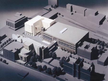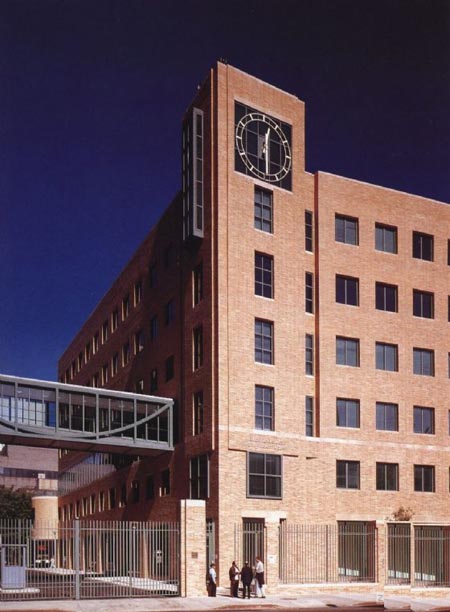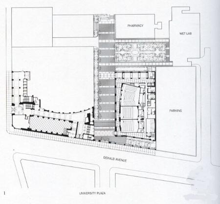 The Health Sciences Center provides new classrooms, la ho rat ones, faculty offices, and administrative space for the College of Pharmacy and 1 leallh Sciences, and the College of Nursing of I ong Island University, ‘n addition, several large lecture rooms for use by the entire university are located in the building. The corner site serves as a major pedestrian and vehicular entrance to the campus. The new building, a southern gateway to the campus, is flanked by a new gate and guard kiosk. Included in the program are six stories of programmed spate, a rooftop penthouse, and a partial basement which contains mechanical systems. University lecture rooms are located on the first floor, with the building lobby, primary entrance, and elevators at the north, facing the courtyard. Administrative areas on the upper floors overlook the courtyard. Faculty offices arc arranged along the west, sit It: of ihe building facing (he pedestrian corridor.