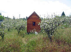 在他的小床上透過教堂般的小窗可以看到加利福尼亞的美麗天空。在潔凈的辦公空間里,便攜計算機緊挨著書架。這個小房子充滿特色,特別是在古典門廊前面,竟然有一棵郁郁蔥蔥的蘋果樹。
