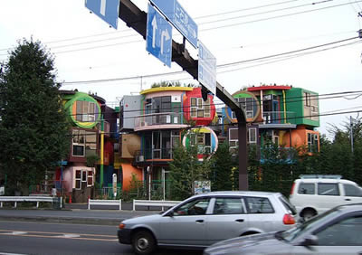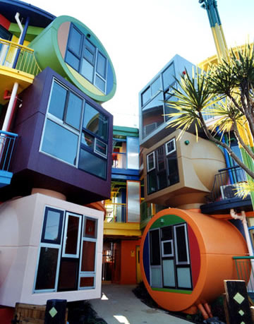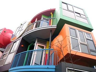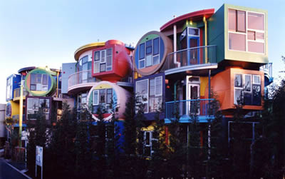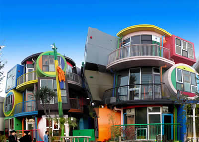 坐落在東京郊外三鷹市的一座住宅堪稱世上最花哨的住宅。這棟住宅樓日本名稱叫“三鷹天命反轉(zhuǎn)住宅”翻譯成中文為“轉(zhuǎn)運閣”。這座住宅三層建筑,只有九戶人家。由日本藝術(shù)家荒川修作和他的妻子、詩人瑪?shù)铝铡で偎垢鶕?jù)多種科學(xué)規(guī)律設(shè)計而成。每套售價76.3萬美元,合500多萬人民幣,盡管比相鄰的住宅貴上兩倍,但還是很搶手。