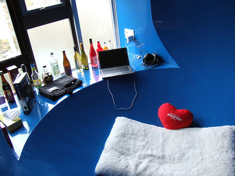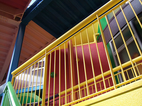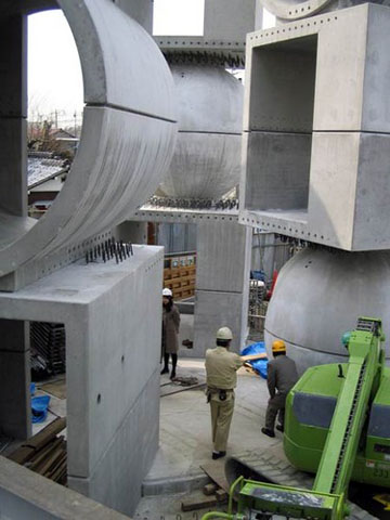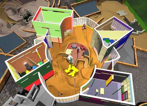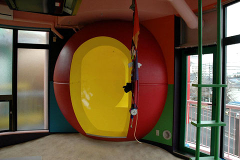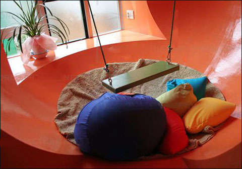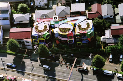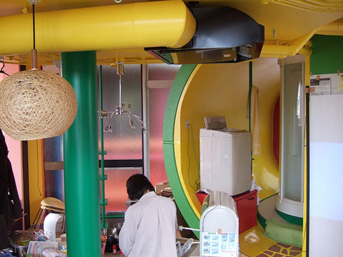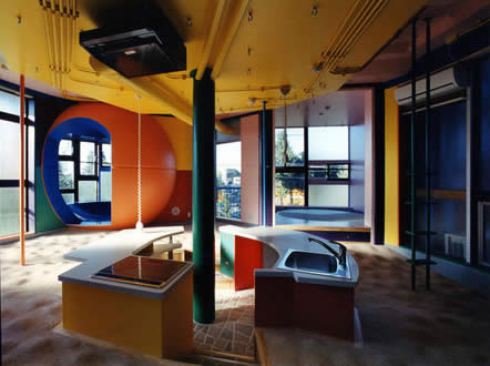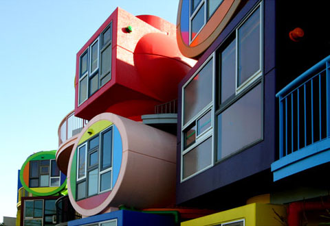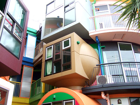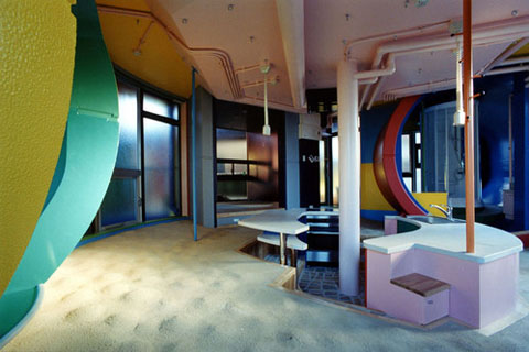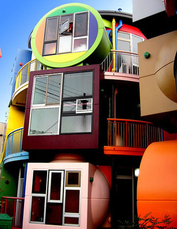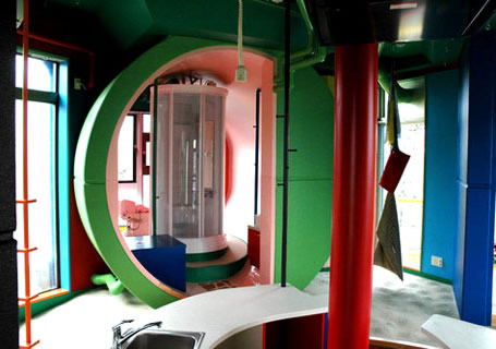 夫妻二人的座右銘是“建筑對抗死亡”!叭藗儯绕涫抢先,不應(yīng)該經(jīng)常保持松弛狀態(tài)或休息直至慢慢衰老!被拇◤娬{(diào),“他們應(yīng)該生活在一個能夠刺激其感官和鼓舞生氣的環(huán)境中!边@座坐落在東京都三鷹市普通住宅區(qū)的三層建筑不但外形奇特,色彩艷麗,建筑內(nèi)部也是波瀾起伏,色彩繽紛。餐廳地板不規(guī)則地傾斜著,廚房是下陷的,書房則布以凹陷的地板。電源開關(guān)被安置在意想不到的地方,你要摸索著去感覺正確的位置才行。
