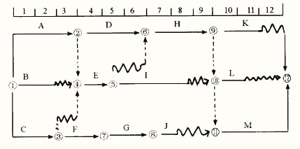1、如圖所示時標(biāo)網(wǎng)絡(luò)計劃中,如果工作B、E、J使用同一臺施工機械并順序施工,則在合理安排的前提下,實施B、E、J三項工作時的施工機械閑置時間( )天。