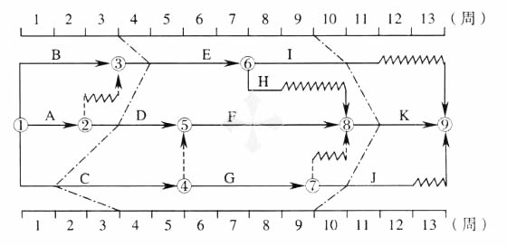 9、某工程雙代號時標網(wǎng)絡(luò)計劃執(zhí)行到第3周末和第9周末時,檢查其實際進度如下圖前鋒線所示,檢查結(jié)果表明( )