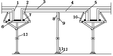 1—梁側(cè)模;2—立檔;3—底模;4—橫楞;5—托木;6—梁底模;7—橫帶;8—橫杠;9—連接板;10—斜撐;11—木楔子;12—墊板;13—立柱。