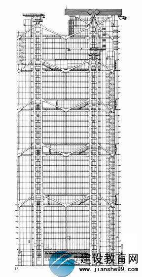 建筑懸掛在排成三跨的四對(duì)鋼柱上。在建筑的整個(gè)高度上,五組兩層高的桁架將鋼柱連接起來,在樓層就懸掛在桁架上。三跨結(jié)構(gòu)的高度不同,形成了一個(gè)錯(cuò)落的輪廓。外墻是特別設(shè)計(jì)的外薄鋁板結(jié)構(gòu)筆透明玻璃般的組合以表現(xiàn)內(nèi)部空間的豐富性。