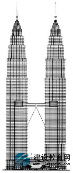 國家石油雙子塔是國際性的設(shè)計,整棟大樓的格局采用傳統(tǒng)回教建筑常見的幾何造型,大多是四方形和圓形。