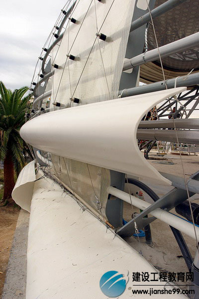 整個(gè)空間被一個(gè)張緊的半透明的乙烯-四氟乙烯制成的“皮膚”覆蓋,這是一種膨脹的塑料屋頂面板組成的矩陣。異形的面板在每一面都印有陰陽格子,當(dāng)它們被灌滿空氣,就會(huì)展開讓日光射入;當(dāng)空氣被放掉,它們就就會(huì)從新緊縮,阻斷光線和天空的景色。這樣的效果看起來幾乎就像一個(gè)活著的器官——一個(gè)巨大的機(jī)器眼睛的格子。