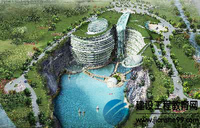 “水下2層,水面17層,坑面2層,一共約21層,只高出地平面15米左右,大部分建筑在坑里,有400個左右的房間,每間客房均設(shè)有觀景露臺!崩钚耜栠@樣介紹,酒店將依附著采石坑的南部巖壁建造,從坑底伸出地面,水面以下是水底餐廳、咖啡館和部分客房。