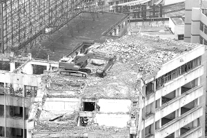 6月9日下午4時許,記者來到渝中區(qū)華一坡原科技情報所辦公樓所在地。本來12層樓的房屋,現(xiàn)在已拆除兩層,周邊沒有與其相等高的樓或山坡。約800平方米的樓頂,已被挖去400平方米,一輛橙色挖掘機(jī)停放在尚未挖除的半邊樓頂上。