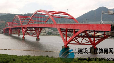 八千里路云和月,關山飛渡若等閑位于臺北市,孔跨布置為44+143+165+143+44米。本橋采用全焊鋼結(jié)構(gòu),大節(jié)段吊裝,典型的柔性拱剛性梁組合體系。