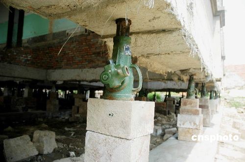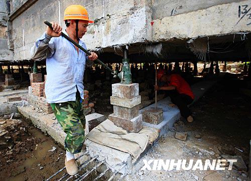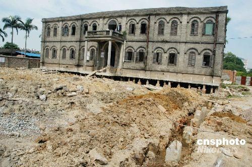 2008年7月3日,福州老洋房泛船浦教堂神父樓在上百個(gè)千斤頂?shù)闹蜗码x地1米,準(zhǔn)備整體平移。