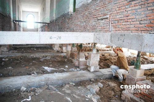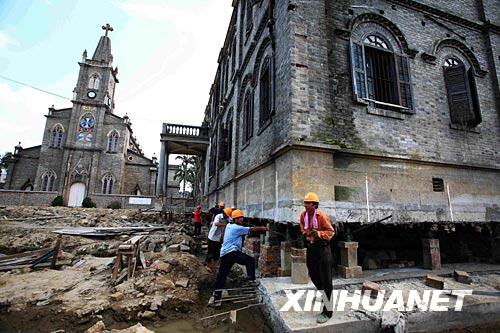 由于道路建設(shè)需要,經(jīng)過一年多準(zhǔn)備,福州市有關(guān)部門決定對(duì)建于1932年的泛船浦教堂神父樓實(shí)施整體平移,以利于文物保護(hù)和減少經(jīng)濟(jì)損失。目前,神父樓底下的混凝土梁架已澆注好,這幢樓將先往東平移75.6米,整體旋轉(zhuǎn)90度,由東西朝向變?yōu)槟媳背,再向南平?0.7米。新華社記者魏培全攝