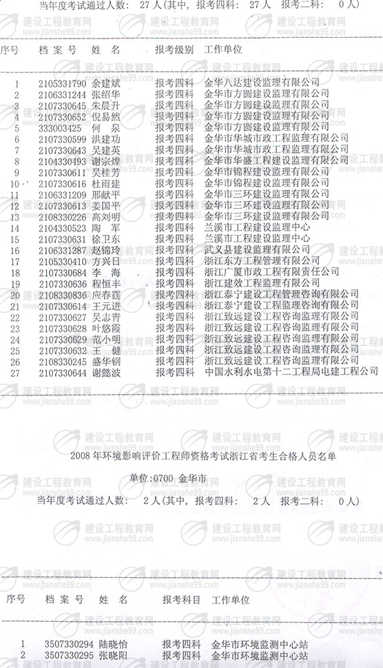 根據(jù)浙江省人事廳浙人發(fā)〔2008〕129、130號(hào)《關(guān)于公布2008年度監(jiān)理工程師執(zhí)業(yè)資格考試合格人員名單的通知》、《關(guān)于公布2008年度環(huán)境影響評(píng)價(jià)工程師職業(yè)資格考試合格人員名單的通知》精神,我市2008年度監(jiān)理工程師和環(huán)境影響評(píng)價(jià)工程師資格考試合格人員名單已經(jīng)審定,現(xiàn)予以公布(名單附后),請(qǐng)盡快通知考生所在單位及本人。考試合格人員取得資格時(shí)間均為:2008年5月11日。