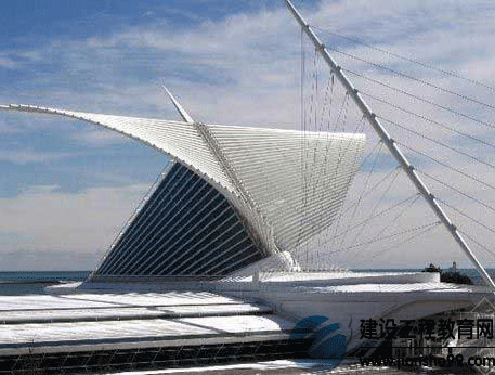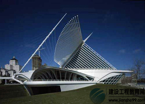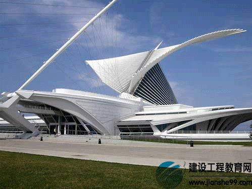 西班牙建筑師卡拉特拉瓦是世界上最著名的創(chuàng)新建筑師之一,可以說是建筑仿生學的集大成者,被稱為"建筑師中的詩人".密爾沃基市藝術(shù)館同樣體現(xiàn)了他血液里那種西班牙人特有的奇異想像力。