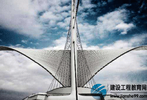 像海鳥一樣的密爾沃基市藝術(shù)館(MilwaukeeArtMuseum),是一座會動的建筑。西班牙建筑師卡拉特拉瓦(SantiagoCalatrava)通過機械傳動裝置,能夠?qū)⒔ㄖ敳康膬蓚像翅膀一樣張開的鋼結(jié)構(gòu)羽翼,在陽光下慢慢張開。這個結(jié)構(gòu)體系是由兩根平行的、傾斜47度的桅桿靠拉力支撐,一根桅桿位于屋面的中軸線上,另一根位于通向藝術(shù)館入口的橋上,這些元素共同創(chuàng)造出了詩意般的結(jié)構(gòu)體系和運動感的整體效果。