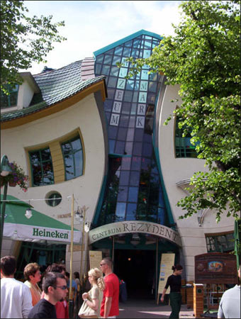 位于波蘭索波特市,是一家生意興隆的購(gòu)物中心的附屬建筑,已成為當(dāng)?shù)刂糜尉包c(diǎn)。它建于2004年,樓身呈扭曲的褶皺形,就像一棟喝醉酒后醉態(tài)可掬的卡通房子。這棟房子之所以會(huì)這樣扭來(lái)扭去,主要是因?yàn)樵O(shè)計(jì)者參照了杰·馬辛·賽瑟及皮爾·達(dá)赫爾博格這兩名畫(huà)家的畫(huà)作,盡情發(fā)揮創(chuàng)意。房子的用色也是夸張而鮮明,奪目的蔚藍(lán)、跳躍的鮮綠、暖暖的淺黃……五顏六色的玻璃及各種裝飾都給人留下深刻印象。由于房子的外觀如此俏皮奇特,索柏市市長(zhǎng)杰克·簡(jiǎn)奴斯基于是將其命名為“扭曲的房子”。