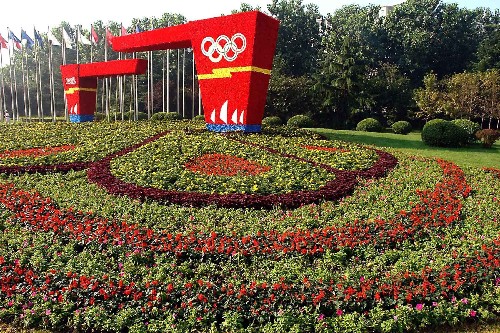 “奧運(yùn)凱旋門”被一個(gè)由各色花卉和植物組成的大型花壇“包圍”(8月3日攝)。