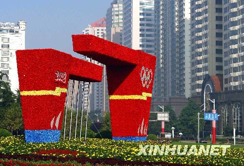 在現(xiàn)代化高樓襯映下的“奧運(yùn)凱旋門”(8月3日攝)。一座大型立體花卉雕塑“奧運(yùn)凱旋門”近日在青島奧帆中心附近落成。“奧運(yùn)凱旋門”由一高一低兩個(gè)相互配合的上舉的雙手造型組成,設(shè)計(jì)新穎,色彩艷麗!皧W運(yùn)凱旋門”四周還布置了數(shù)萬盆各色花卉,包含著條條道路通往成功之門的寓意,表達(dá)了青島人民迎接奧運(yùn)的喜悅心情。