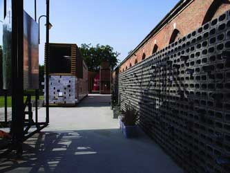 出于保護(hù)歷史遺跡的考慮,“應(yīng)對”的部分被安排在了通往處女花園的過道上,五個(gè)又像裝置,又像房子的“建筑”順著過道依次排開—紙房子、會收集雨水的房子,會移動的墻、能住人的腳手架、用碎磚塊和稻草制成的建筑用磚。