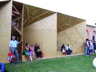 一棟用紙盒、紙筒、透明膠帶搭起的建筑—這是鳥巢中方設(shè)計(jì)師李興鋼做的《紙磚宅》;一間屋頂向中間凹陷,能將雨水收集重新利用的房子—劉克成的《集水墻》;一面墻,由中空的灰色磚砌成,一旁展示的制作過程告訴觀眾,這些磚是以殘瓦碎磚為原料制成的—劉家琨為汶川地震而設(shè)計(jì)的《再生磚》;給腳手架釘上木板,讓造房子的工具變成可以人住的房子—童明的《支架棲所》;幾面會反光的鋁板制成的“墻”,各自構(gòu)架在鋼支架上,每個(gè)支架下還有一輛自行車,可以載著“墻”移動—完全概念化的建筑模型,這是葛明的作品《默默》。