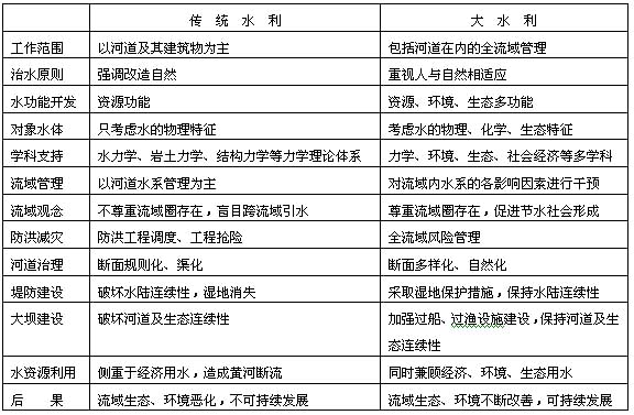 按照大水利的理論,流域規(guī)劃要全面地考慮流域的水文、自然和社會(huì)特征,即“天時(shí)”、“地利”、“人和”,以謀求流域內(nèi)社會(huì)的可持續(xù)發(fā)展為規(guī)劃目標(biāo)。我在過(guò)去提出的大水利理論中曾經(jīng)對(duì)新舊水利理論的差異列表進(jìn)行了比較(表2),這張表有助于我們較好地理解它們本質(zhì)上的差別。