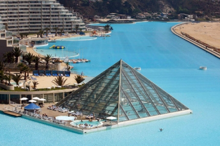 《吉尼斯世界紀(jì)錄》確認(rèn)智利海邊的一個(gè)巨大的游泳池是世界上最大的游泳池。這個(gè)游泳池有1000碼長(zhǎng)(約914米),占地20英畝(約8.1萬(wàn)平方米),最深處達(dá)115英尺(約35米),能容納6600萬(wàn)加侖水(約25萬(wàn)立方米)。如果你喜歡在這個(gè)游泳池中暢游,那你在潛入水中之前,一定要喝足了能量飲料,否則你可能游不回來(lái)了。