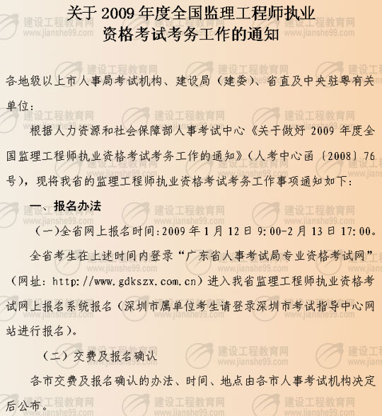 廣東省2009年度全國監(jiān)理工程師執(zhí)業(yè)資格考試1月12日-2月13日報(bào)名
