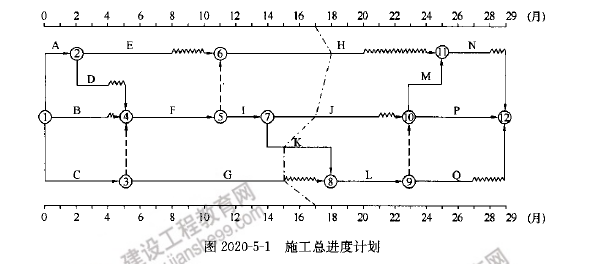 【2020年】(試題五)某工程,建設(shè)單位與施工單位按照《建設(shè)工程施工合同(示范文本)》簽訂了施工合同。經(jīng)總監(jiān)理工程師審核確認(rèn)的施工總進(jìn)度計(jì)劃如圖2020-5-1所示,各項(xiàng)工作均按最早開始時(shí)間安排且勻速施工。