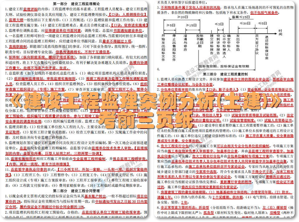 考前三頁紙,是專門為考生們精心打造的備考利器。它涵蓋了《建設(shè)工程合同管理》《建設(shè)工程監(jiān)理案例分析(土建)》《建設(shè)工程監(jiān)理概論》《建設(shè)工程目標(biāo)控制(土建)》四個(gè)科目的核心考點(diǎn)。這些內(nèi)容都是考試的重點(diǎn)、難點(diǎn),通過簡潔明了的方式呈現(xiàn),幫助你在有限的時(shí)間內(nèi)迅速掌握關(guān)鍵知識點(diǎn)。