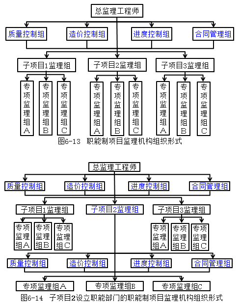 職能制組織形式一般適用于大中型建設(shè)工程,如圖6-13所示。如果子項目規(guī)模較大時,也可以在子項目層設(shè)置職能部門,如圖6-14所示。