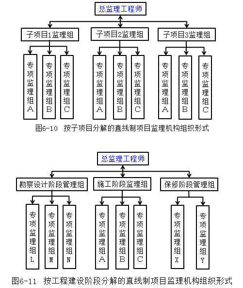 直線制組織形式的特點是項目監(jiān)理機(jī)構(gòu)中任何一個下級只接受唯一上級的命令。各級部門主管人員對各自所屬部門的事務(wù)負(fù)責(zé),項目監(jiān)理機(jī)構(gòu)中不再另設(shè)職能部門。