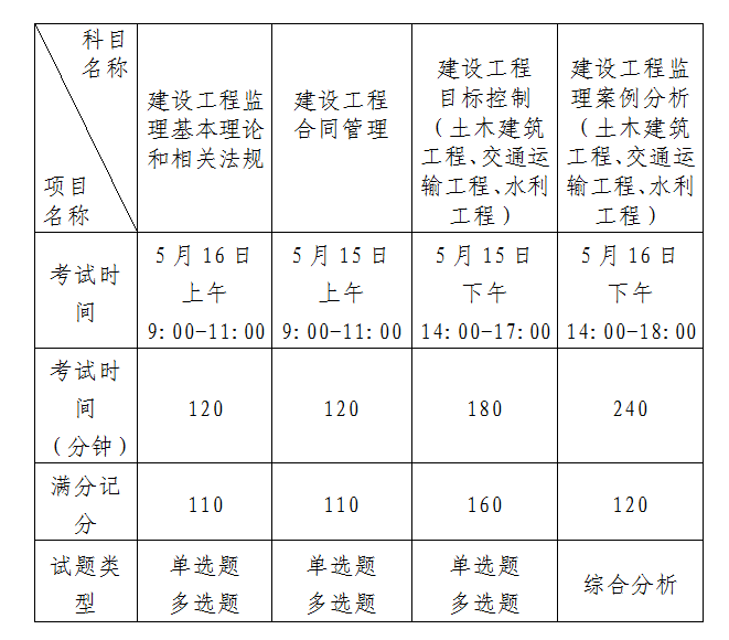 監(jiān)理工程師職業(yè)資格考試設《建設工程監(jiān)理基本理論和相關法規(guī)》(客觀題)、《建設工程合同管理》(客觀題)、《建設工程目標控制》(客觀題)和《建設工程監(jiān)理案例分析》(主觀題)4個科目。其中《建設工程監(jiān)理基本理論和相關法規(guī)》和《建設工程合同管理》為基礎科目;《建設工程目標控制》和《建設工程監(jiān)理案例分析》為專業(yè)科目。專業(yè)類別分為土木建筑工程、交通運輸工程和水利工程,報考人員可根據(jù)實際工作需要選報其一。監(jiān)理工程師職業(yè)資格考試成績實行4年為一個周期的滾動管理,參加4個科目考試(考全科)的人員須在連續(xù)4個考試年度內通過全部應試科目;參加2個科目考試(免二科)的符合免試基礎科目人員須在連續(xù)2個考試年度內通過相應應試科目,方可獲得資格證書。已取得監(jiān)理工程師一種專業(yè)職業(yè)資格證書的人員,報名參加其他專業(yè)科目考試的(增報專業(yè)),可免考基礎科目,在連續(xù)2個考試年度內通過相應應試科目,可獲得相應專業(yè)考試合格證明,該證明作為注冊時增加執(zhí)業(yè)專業(yè)類別的依據(jù)。